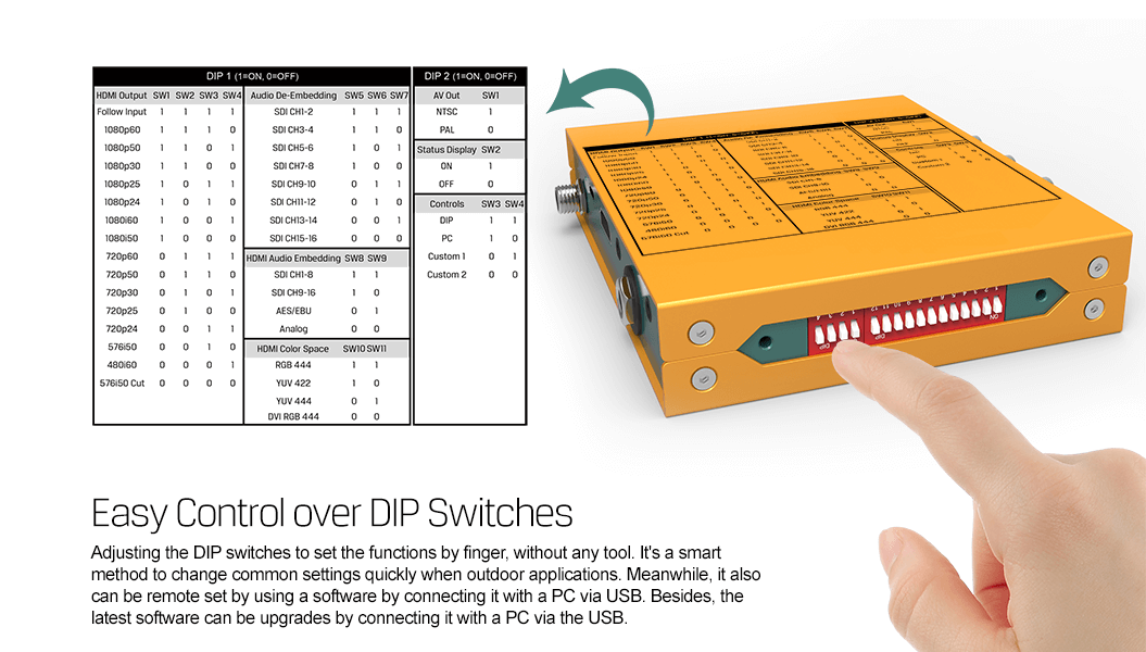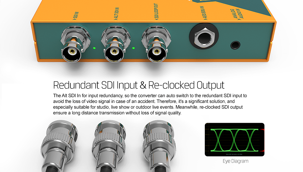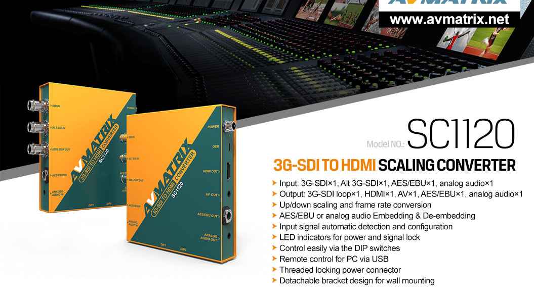 SC1120 is an exquisite and professional SDI converter to convert SDI signal to HDMI and AV signals at the same time. The format of the output can realize pass through or up/downscaling and frame rate conversion. De-interlacing function and seamless conversion can also be supported to avoid jitter. It also features AES/EBU or analog audio embedding and de-embedding. All the functions can be easily set by built-in DIP switchers or PC via USB. SC1120 is your ideal choice for broadcasting and AV post-production applications. More info..