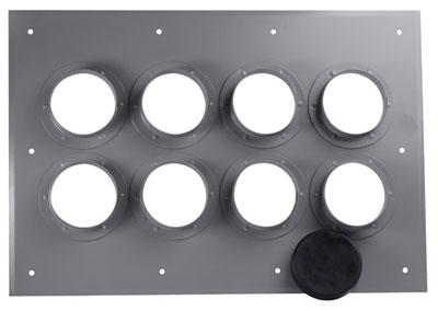 Plate with one or more 4 inch (102mm) holes. Weatherproof sealing caps included. Use with the corresponding size rubber cable boot (sold separately).