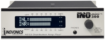 The INOmini 300 is a compact, DSP-based 1x3 DA specifically for AES digital audio. It reads and displays digital-signal metadata and features independent metering and audio level control on all outputs. A front-panel headphone jack lets you monitor the digital audio, and flashing alarms warn of level and phase problems; channels and phase can be swapped to correct for source errors. The INOmini 300 accepts any input sampling rate and can convert the output to the usual rates between 32kHz and 192kHz.