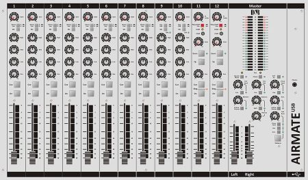 - The Airmate-12-USB has the usual master controls such as stereo master faders, stereo Aux sends and return, monitor master with "follow phones" and a phones output with a split control function. There is a balance control to continuously adjust the volume between the main output and stereo Cue signal.