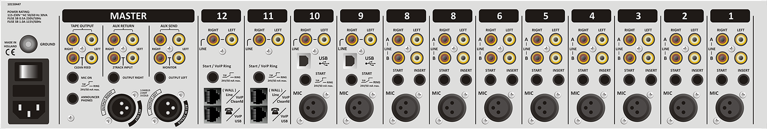 - Built around well proven low noise circuitry, this console is the reliable workhorse for the self-op production D.J. that needs 10 Mic inputs an internal Telephone Hybrid (2x) and USB connection to the PC (e.q. for streaming to the web). A heavy duty 19" rack mounted RF shielded chassis houses 12 vertical triple input modules giving flexibility rarely found in a mixer of this type. Ten input channels with high quality balanced microphone inputs on XLR and two stereo line level inputs on Cinch (RCA) connectors. Every Mic input has an insert for signal processors. And… every line level line B input can be converted into a phono (record player) channel by simply fitting an optional stereo R.I.A.A. equalized phono pre-amp.