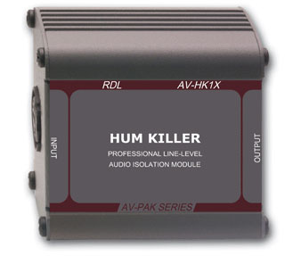 Galvanic isolation between the input and output is provided by a studio quality audio transformer. The AV-HK1X breaks the "ground loop" connection that can produce hum in a sound system. The input connector shield does provide a radio frequency ground return, thereby preserving system immunity to radio interference.