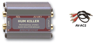 The AV-HK1 is a stereo transformer isolation module for use with unbalanced, high impedance audio inputs. Input and output connections are provided on gold‑plated phono jacks. The AV-HK1 is supplied with two adapter cables to facilitate connecting with products that use mini-plugs and jacks.