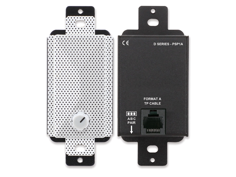 The D SERIES-PSP1A is a compact active loudspeaker that delivers rich, detailed sound in Decora-compatible wall or chassis mounts. It is a single-pair audio amplifier module compatible with RDL Format A twisted pair products. The PSP1A receives audio and 24 Vdc power through a rear-panel RJ45 jack. A rear-panel switch set during installation determines which of the three FORMAT-A pairs is amplified. Amplification is provided by a high-efficiency Class D power stage with audio filtering tailored for crisp, pleasant audio clarity. The high-efficiency Class D output stage produces negligible heat for all levels of expected voice or music modulation. The amplified output level is controlled by a front-panel volume control. The PSP1A includes an analog compressor/limiter that makes higher average sound output levels possible without clipping.