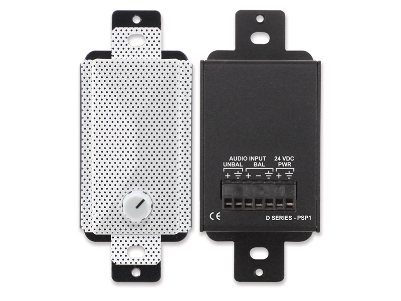 The D SERIES-PSP1 is a compact active loudspeaker that delivers rich, detailed sound in Decora-compatible wall or chassis mounts. The input accepts either a -10 dBV unbalanced or a +4 dBu balanced signal on the rear-panel detachable terminal block. Amplification is provided by a high-efficiency Class D power stage with audio filtering tailored for crisp, pleasant audio clarity. The high-efficiency Class D output stage produces negligible heat for all levels of expected voice or music modulation. The amplified output level is controlled by a front-panel volume control. The -PSP1 includes an analog compressor/limiter that makes higher sound output levels possible without clipping.