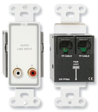 The TPS6A is a single-pair audio sending module compatible with RDL Format-A twisted pair products. The front panel features two gold plated phono jacks intended for stereo consumer line level audio sources. A studio quality transformer provides isolation between the audio source and the RJ45 TP CABLE.