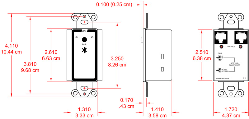 The D SERIES-BT1A modules are Bluetooth audio receiving modules compatible with RDL® Format-A twisted pair receivers. When paired with a compatible Bluetooth enabled device, the module receives stereo audio from the Bluetooth source. The stereo signal is sent through two Format-A pairs to any RDL Format-A receiver. A stereo/mono switch set by the installer permits summed mono audio to be sent over one switch-selected pair to the Format-A receiver.