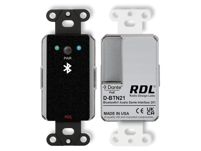 The D SERIES-BTN21 modules are Dante or AES67 networked, wall-mounted audio interfaces that provide bidirectional Bluetooth audio. The modules are configurable using RDL CONSOLE software and are controllable by compatible remote controls or software. The module multicasts Bluetooth media data and module function status for use with RDL CONSOLE software, compatible RDL remote controls and other compatible software. Stereo or summed mono audio is available to users through two Dante network channels. Stereo or mono audio may be selected using RDL CONSOLE software or by remote control commands. One Dante channel may be routed back to a connected device through the Bluetooth interface enabling full duplex communication.