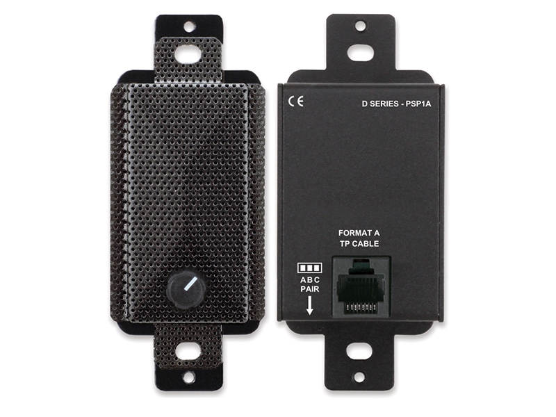 The D SERIES-PSP1A is a compact active loudspeaker that delivers rich, detailed sound in Decora-compatible wall or chassis mounts. It is a single-pair audio amplifier module compatible with RDL Format A twisted pair products. The PSP1A receives audio and 24 Vdc power through a rear-panel RJ45 jack. A rear-panel switch set during installation determines which of the three FORMAT-A pairs is amplified. Amplification is provided by a high-efficiency Class D power stage with audio filtering tailored for crisp, pleasant audio clarity. The high-efficiency Class D output stage produces negligible heat for all levels of expected voice or music modulation. The amplified output level is controlled by a front-panel volume control. The PSP1A includes an analog compressor/limiter that makes higher average sound output levels possible without clipping.