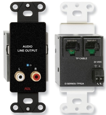 APPLICATION: The D SERIES-TPR2A modules feature two RCA phono jack outputs, one for the left channel output and one for the right channel. The audio signals received from pairs B and C of the twisted pair cable are buffered to drive the output jacks at the standard -10 dBV consumer level.