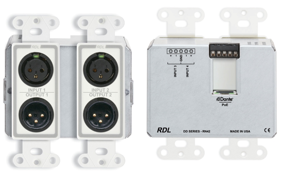 The two rear-panel balanced or unbalanced inputs are each converted to a separate Dante network transmit channel. Control software sets the gain for an input level of either +4 dBu or -10 dBV. RDL Decora®-style jack plates matching the appearance of the DD-RN42 are optionally available for connection of various audio sources to the rear-panel inputs. An input plate may be located together with the DD-RN42 in a triple gang box or may be mounted remotely in a single box.