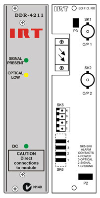 The DDR-4211 receiver uses a PIN photodiode detector with signal conditioning and reclocking circuits. The data rate is factory set for 270 Mb/s operation. Link settings allow STM-1 data rates (electrical and optical) to be set for interfacing with IRT's STM-1 interface cards.
