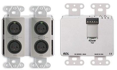 The DDS-BN40 is a complete wall-mounted Dante audio network interface. It features four XLR mic or line inputs on the front panels and two line outputs on a rear-panel detachable terminal block. Special software is not required to configure the DDS-BN40. Each input provides three switches that may be set from the front of the unit when the cover plate is not installed. One switch enables or disables P48 phantom for that input; the second switch selects the mic or line gain range; the third switch sets the gain. Each output provides a switch to set the output to balanced professional or unbalanced consumer level. The DDS-BN40 fits a standard US dual-gang electrical box or an RDL WB-2 back box for installations in thinner European or equivalent walls. The DDS-BN40 is PoE powered, and is available in multiple finishes with optional customized graphics.