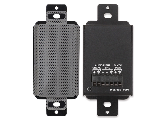 The D SERIES-PSP1F is a compact active loudspeaker that delivers rich, detailed sound in Decora-compatible wall or chassis mounts. The input accepts either a -10 dBV unbalanced or a +4 dBu balanced signal on the rear-panel detachable terminal block. Amplification is provided by a high-efficiency Class D power stage with audio filtering tailored for crisp, pleasant audio clarity. The high-efficiency Class D output stage produces negligible heat for all levels of expected voice or music modulation. The amplified output level is set by the installer using a volume control located behind the speaker grill. The PSP1F includes an analog compressor/limiter that makes higher average sound output levels possible without clipping.