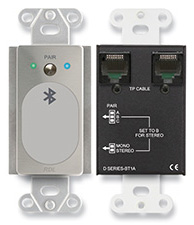 The D SERIES-BT1A modules are Bluetooth audio receiving modules compatible with RDL® Format-A twisted pair receivers. When paired with a compatible Bluetooth enabled device, the module receives stereo audio from the Bluetooth source. The stereo signal is sent through two Format-A pairs to any RDL Format-A receiver. A stereo/mono switch set by the installer permits summed mono audio to be sent over one switch-selected pair to the Format-A receiver.