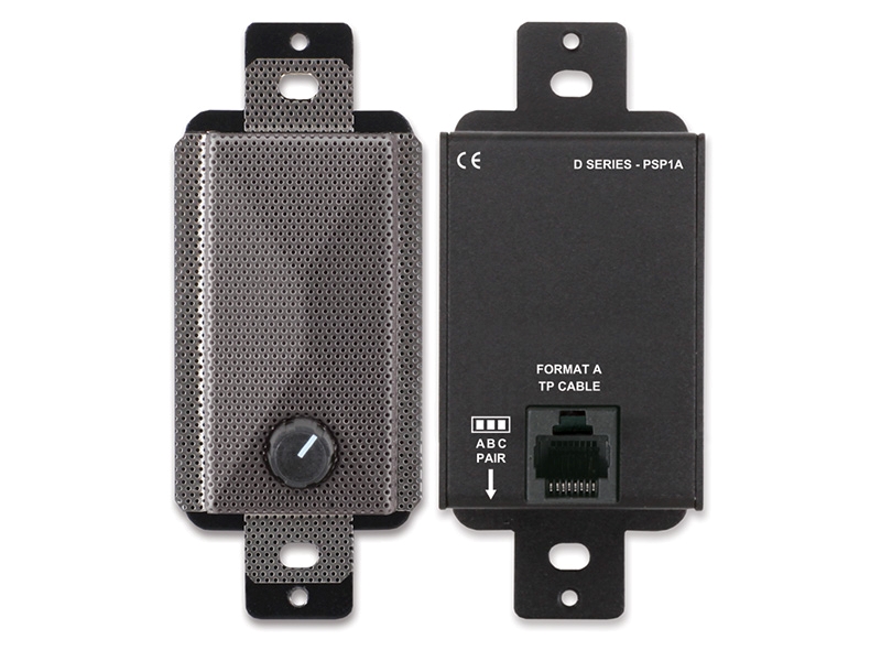 The D SERIES-PSP1A is a compact active loudspeaker that delivers rich, detailed sound in Decora-compatible wall or chassis mounts. It is a single-pair audio amplifier module compatible with RDL Format A twisted pair products. The PSP1A receives audio and 24 Vdc power through a rear-panel RJ45 jack. A rear-panel switch set during installation determines which of the three FORMAT-A pairs is amplified. Amplification is provided by a high-efficiency Class D power stage with audio filtering tailored for crisp, pleasant audio clarity. The high-efficiency Class D output stage produces negligible heat for all levels of expected voice or music modulation. The amplified output level is controlled by a front-panel volume control. The PSP1A includes an analog compressor/limiter that makes higher average sound output levels possible without clipping.