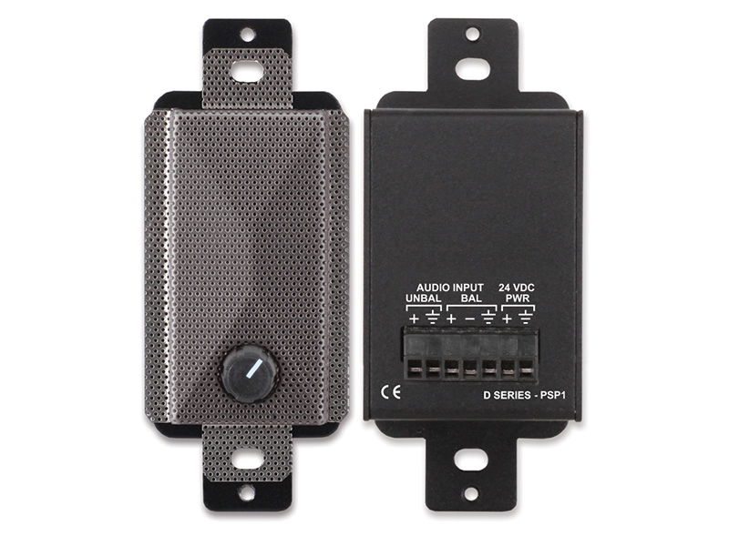 The D SERIES-PSP1 is a compact active loudspeaker that delivers rich, detailed sound in Decora-compatible wall or chassis mounts. The input accepts either a -10 dBV unbalanced or a +4 dBu balanced signal on the rear-panel detachable terminal block. Amplification is provided by a high-efficiency Class D power stage with audio filtering tailored for crisp, pleasant audio clarity. The high-efficiency Class D output stage produces negligible heat for all levels of expected voice or music modulation. The amplified output level is controlled by a front-panel volume control. The -PSP1 includes an analog compressor/limiter that makes higher sound output levels possible without clipping.