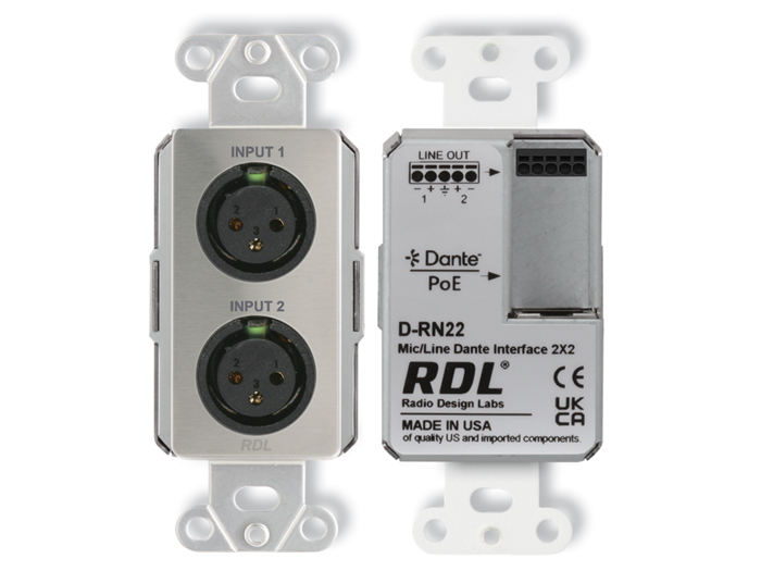 The D-RN22 is a complete wall-mounted Dante or AES67 audio network interface. It features two XLR mic or line inputs on the front panel and two balanced line outputs on a rear-panel detachable wiring block. The module is configured and adjusted using RDL CONSOLE or other network control software. The D-RN22 fits a standard US single-gang electrical box or an RDL WB-1U back box for installations in European or similar thinner walls. The D-RN22 is PoE powered and is available in multiple finishes with optional customized graphics.