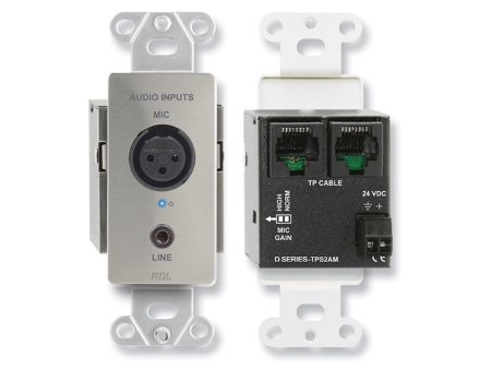 The D SERIES-TPS2AM modules are two-pair audio sending modules compatible with RDL Format-A twisted pair products. These modules are designed to be mounted in-wall boxes, cabinets or other enclosures that allow users to connect audio sources. The -TPS2AM models mount in RDL WB-1U and WB-2U wall boxes, or in standard U.S. electrical boxes. The D-TPS2AM features a white front-panel laminate with grey lettering that matches RDL Decora©-style remote controls. The DB-TPS2AM features a black front-panel laminate. The DS-TPS2AM is constructed of stainless steel to coordinate with RDL Decora-style stainless steel remote controls in commercial/industrial installations.