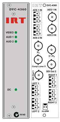 The DVC-4360 is designed to fit IRT's standard Eurocard frames as well as IRT's 4000 series frame for use with IRT's SNMP system and may be used alongside any other of IRT's analogue or digital Eurocards.