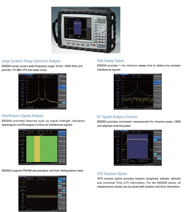 The Deviser E8000A handheld spectrum analyzer is an ideal testing instrument for engineer working at the wireless base station for 2G/3G/4G, WiFi and broadcast installation and maintenance. E8000A covers frequency range: 9 kHz ~ 3000 MHz and has tracking