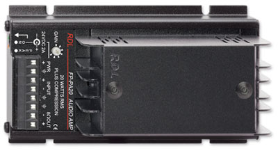 The FP-PA20 features a balanced line level input that may be connected unbalanced. A front panel gain control is designed to be adjusted either manually or with a trimming screwdriver. The gain range will accommodate standard unbalanced levels as well as professional balanced levels. The output will drive an 8 Ohm speaker or multiple speakers connected to present an 8 Ohm load to the amplifier. Audio levels that could cause the amplified output to clip are compressed using two dynamic time constants designed to preserve aural transparency. Normal audio level signals remain unaffected by the compressor thereby preserving audio dynamics and preventing the compressor from increasing feedback potential when the amplifier is used for paging. The FP-PA20 produces average audio levels and audio clarity normally expected of amplifiers delivering much higher output power.