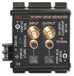 The FP-SPR1 is the ideal product for applications requiring either conversion between SPDIF connector types or recovery of low SPDIF signal levels. Power connections are made using either the full size barrier block terminals or a DC power jack located in one end panel. A second dc power jack is provided on the other end panel for connecting additional FLAT-PAK modules.
