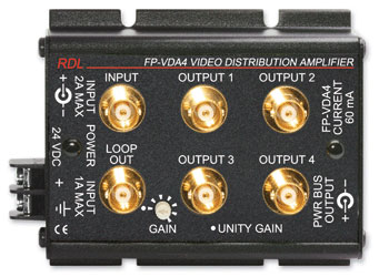 The FP-VDA4 is the ideal choice in many applications where video signals need to be distributed. Video input and output connections are made on the top panel BNC jacks. Power connections are made using either the full size barrier block terminals or a dc power jack located in one end panel. A second dc power jack is provided on the other end panel for connecting additional FLAT-PAK modules.