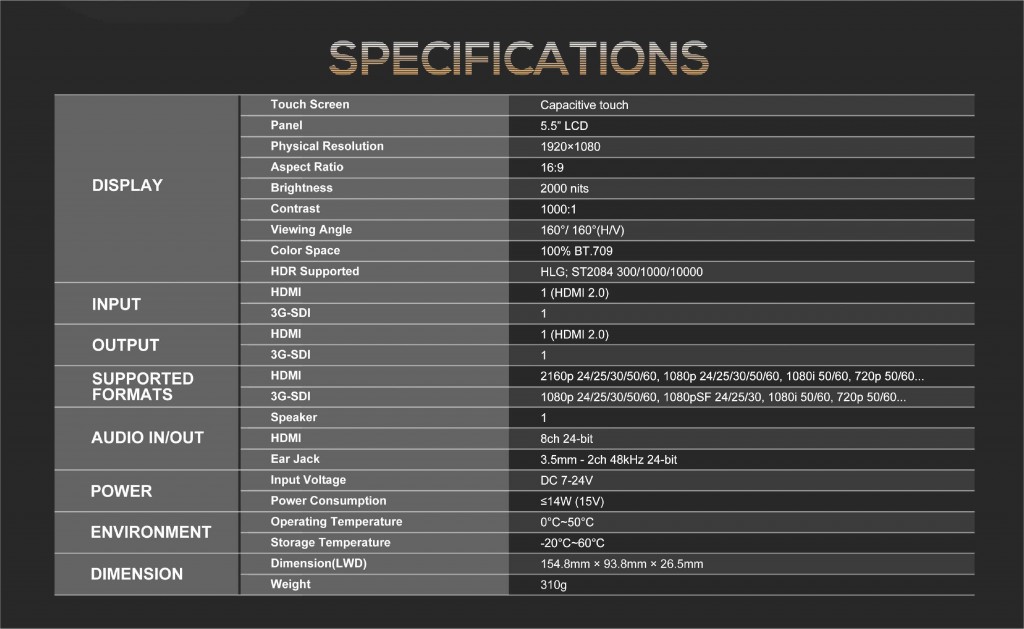 The Lilliput HT5S is a powerful and versatile monitor that is perfect for DSLR users. With its 5.5" screen and 1920 x 1080 pixel panel, it can easily display a 4K 2160P 60Hz input and has a high brightness of 2000cdm², making it an excellent choice for outdoor shoots.