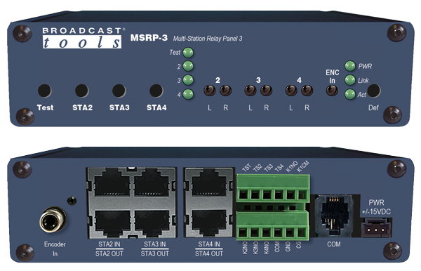 The Broadcast Tools MSRP-3 is a three station analog stereo EAS relay/switcher following in the footsteps of the original Multi-Station Relay Panel (MSRP) designed by Broadcast Tools for the Sage ENDEC in 1996. The MSRP-3 provides additional alert audio distribution and transparent audio interrupt switching for the Sage ENDEC and other EAS encoders. Together with the single balanced stereo-switched audio interrupt relay built into the ENDEC, an ENDEC and MSRP-3 will provide interrupt switching for four stereo audio paths. Each alert insertion can occur simultaneously on one or more station outputs, but alerts can not be overlapped.