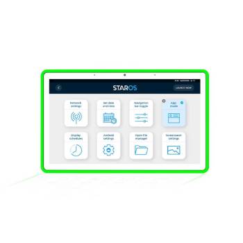 STAROS, pre-installed on Glory Star Android devices, is a secure kiosk software that locks devices into dedicated single-app or multi-app kiosk modes. It offers app lockdown, e-commerce screensavers, and integrates with Star Control for centralized device management.