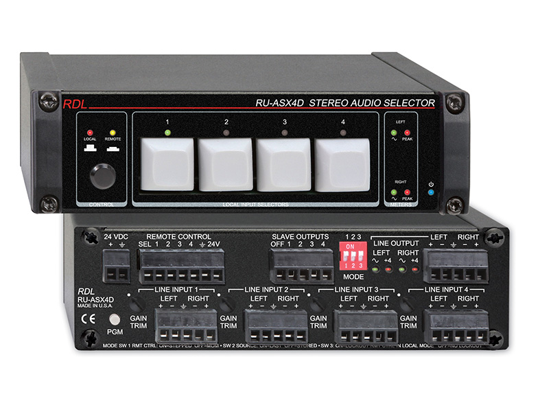 The RU-ASX4D is a four channel stereo audio selector with input gain adjustments and output level metering. The inputs and outputs are connected on rear-panel detachable terminal blocks.