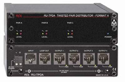The RU-TPDA is a four output signal and power distributor module compatible with RDL Format-A twisted pair products. The INPUT RJ45 jack accepts a twisted pair cable originating from one or multiple FORMAT-A senders. The LOOP OUT connector permits the input signal to daisy-chain to additional distributor modules. The RU-TPDA input circuits bridge the cable pairs, allowing up to 10 distributors to be connected together to produce 40 distributed outputs. Further expansion is possible by using one distributor output to drive up to an additional 10 distributors.