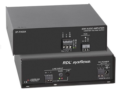 The SF-PA50A is a 50 Watt audio power amplifier that converts one analog input to a 70 V or 100 V constant voltage amplified output.