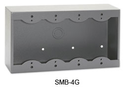 The SMB-1, 2, 3 and 4 surface mount boxes hold one, two, three or four Decora style products, including RDL remote controls and connector plates. Knockouts are provided for fastening standard metric or North American conduits to the rear of the box and to either the upper or lower surface, depending on the orientation of the box when it is mounted. The sides and top or bottom of the box maintain a smooth surface for a finished appearance superior to that of a standard electrical box. Model numbers with a suffix "W" are white; with a suffix "G" are gray to complement RDL stainless steel remote controls and plates. All SMB boxes are constructed from welded steel with a high quality powder coated finish.
