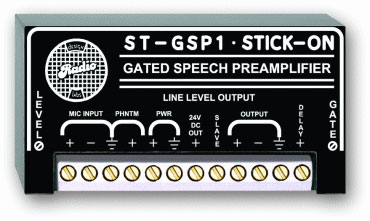 The ST-GSP1 is a gated speech preamplifier designed to be used in a variety of situations where it is desired to produce an automatically switched line-level signal from a microphone. This module may be used in conjunction with other RDL modules to configure automatic mixing systems or may be used alone as a voice-operated module. The open-collector slave output may be used to trigger other equipment or RDL modules. The versatility of ST-GSP1 applications range from complete automatic mixing system design to the addition of automatic mic gating to the inputs of conventional mixers or amplifiers.