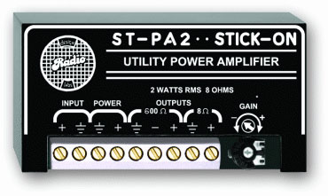 The ST-PA2 features a single, unbalanced audio input, a gain control, and two outputs. The first output is designed to deliver a clean 2 watts RMS into an 8 Ohm speaker. The second output is intended to drive 600 Ohm transformers, typically on equipment inputs. This makes the ST-PA2 uniquely suited to applications such as music-on-hold inputs on telephone systems which may have either 8 Ohm or 600 Ohm inputs. If desired, both outputs may be used at the same time.