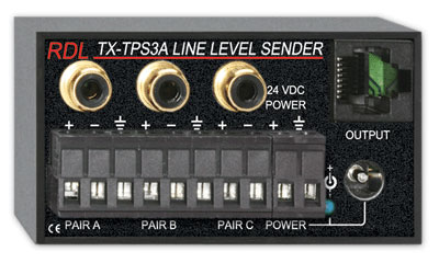 The TX-TPS3A is a three-pair audio sending module compatible with RDL Format-A twisted pair products. Three line-level sources may be connected to the module, each using either the -10 dBV unbalanced RCA phono jack or the +4 dBu balanced detachable terminal block. Studio-quality buffer amplifiers feed the RJ45 OUTPUT at the correct operating level.