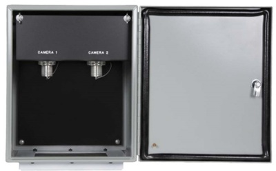 Clark Wire & Cable's FBW series Mini Wall enclosure is a small profile box for space savings and flexibility. Available in powder coated painted steel or stainless steel, this extremely durable enclosure can be used indoors or outdoors. Cable access cutout on bottom allows for cables to be plugged on with the door shut. Available with 1, 2, or 3 camera connections and optional locking latch. Fiber splice tails and mating hardware included.