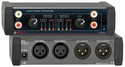 The EZ-AFC2 is a stereo bi-directional audio format converter with level controls. Conversion is provided between balanced rear-panel XLR jacks and unbalanced front-panel RCA jacks. LED VU metering is provided for all audio channels facilitating adjustment for high or low input levels. The bi-directional format allows the EZ-AFC2 to fully convert the stereo input and stereo output of a consumer audio product to professional balanced standards. The EZ-AFC2 is used in houses of worship, studios, sound booths, home component systems and commercial sound systems.