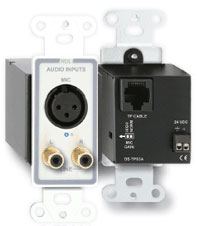 The TPS3A modules features an XLR microphone input and two RCA phono jack inputs, one for the left channel source and one for the right channel source. The unbalanced inputs are designed to receive standard -10 dBV consumer level signals. The microphone input provides 24 Vdc IEC phantom voltage and accepts both dynamic and condenser microphone signals. The input signals are amplified using studio-quality preamplifiers optimized for normal operating levels. A rear-panel GAIN switch is provided to set the amplification of the microphone preamplifier. This switch is normally set by the installer for NORM (normal) gain. If consistently low mic levels are expected, this switch may be set to the HIGH gain position. The pre-amplified microphone source is routed to pair A. The buffered left and right line-level inputs are routed to output cable pairs B and C.