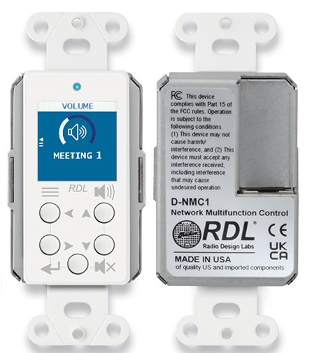 The D SERIES-NMC1 is a remote control that provides source selection and volume control at single or multiple locations. The -NMC1 connects to a digital network that may include compatible RDL audio and control modules as well as Dante devices from RDL and other manufacturers. The unit is menu-driven using a full-color LCD display. Each -NMC1 operates as a Controller or Satellite control permitting up to eight remote controls to work together to select sources, set Dante routing and adjust levels. Setup is accomplished in a web-browser session hosted by the -NMC1. The installer enables menus and submenus required to provide the desired end-user control, with the option of customizing the screen menu and function names.