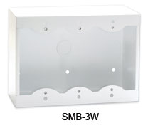 The SMB-1, 2, 3 and 4 surface mount boxes hold one, two, three or four Decora style products, including RDL remote controls and connector plates. Knockouts are provided for fastening standard metric or North American conduits to the rear of the box and to either the upper or lower surface, depending on the orientation of the box when it is mounted. The sides and top or bottom of the box maintain a smooth surface for a finished appearance superior to that of a standard electrical box. Model numbers with a suffix "W" are white; with a suffix "G" are gray to complement RDL stainless steel remote controls and plates. All SMB boxes are constructed from welded steel with a high quality powder coated finish.