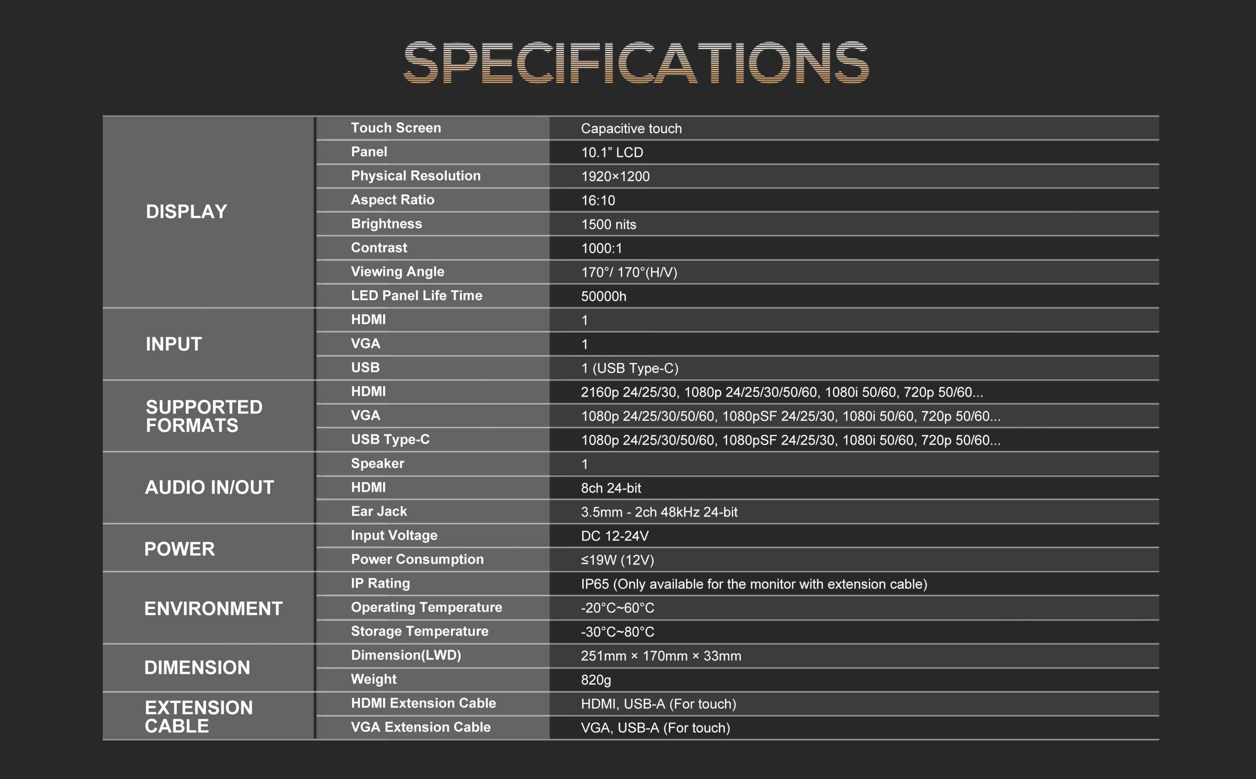 » FA1019/C 10.1″ 1500 Nits High Brightness Industrial grade HDMI / VGA MonitorTechnical Specification (PDF) Download