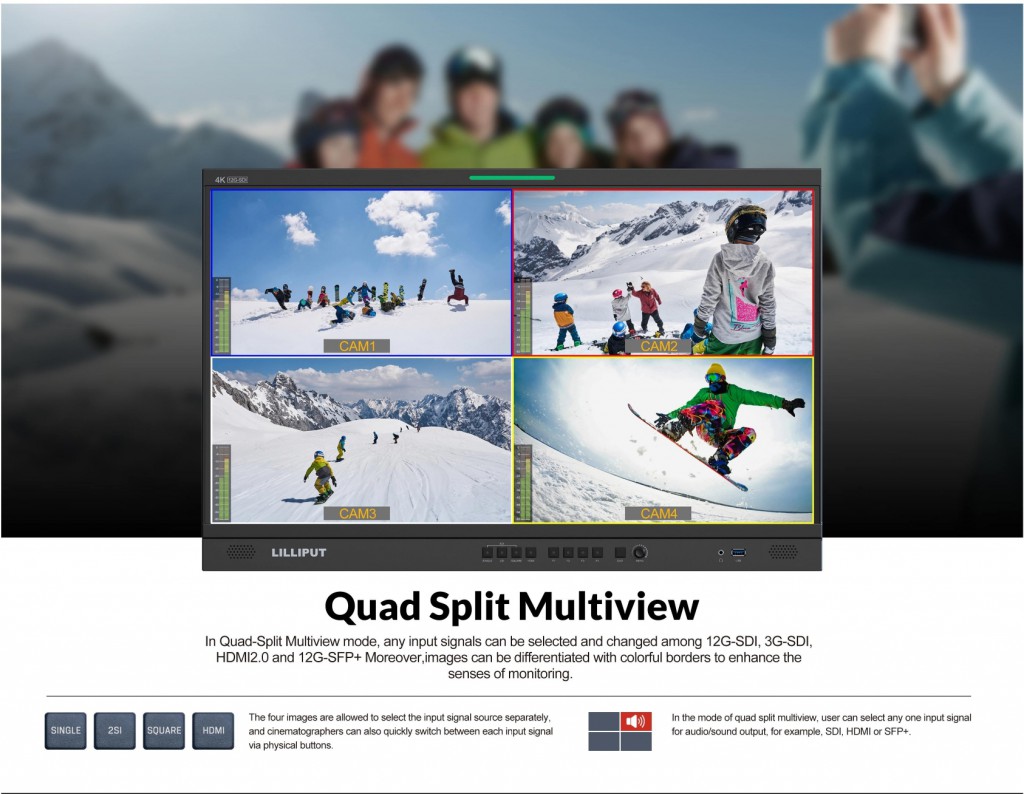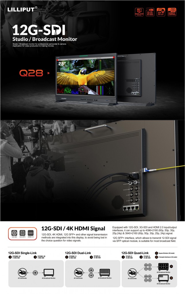 Presenting Lilliput’s professional-grade Gold mount Q28, a 28″ 12G-SDI Professional Production Studio Monitor. This Lilliput studio display boasts an impressive 3840 x 2160 screen resolution, capable of receiving DCI 4K60 signals that seamlessly play as letterboxed content within the appropriate aspect ratio. With two 12G-SDI and two 3G-SDI inputs, along with an HDMI input featuring corresponding loop outputs, the Q28 offers extensive connectivity options. Additionally, it incorporates a 12G-SFP port for optional fibre-optic connectivity, ensuring versatility in your production setup—all while supporting 4K resolution and embedded multichannel digital audio. Trust Lilliput for a professional studio monitor that meets the demands of high-quality production environments.