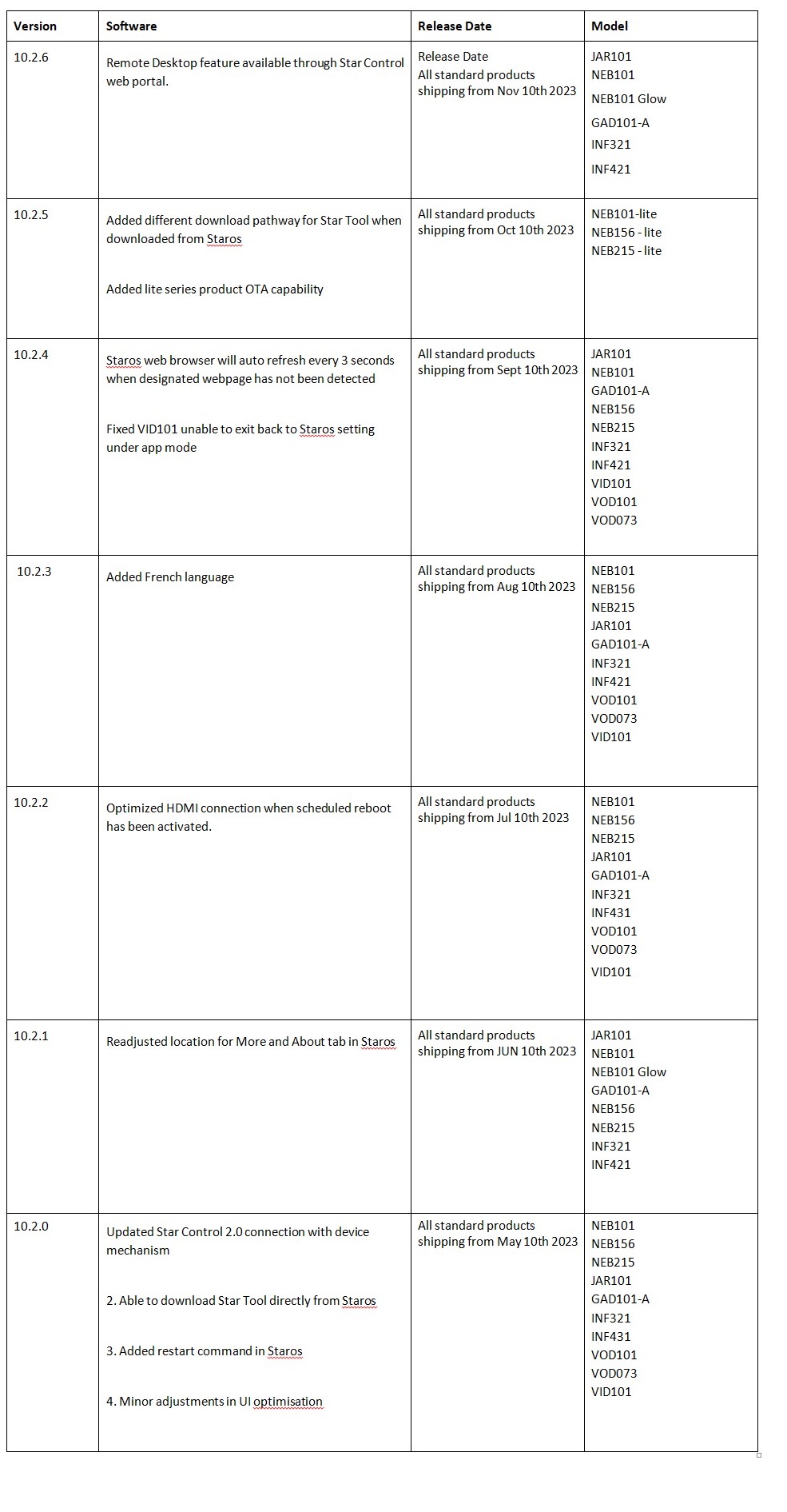 All products shipped from November 8th, 2023 will include STAROS 10.2.6.